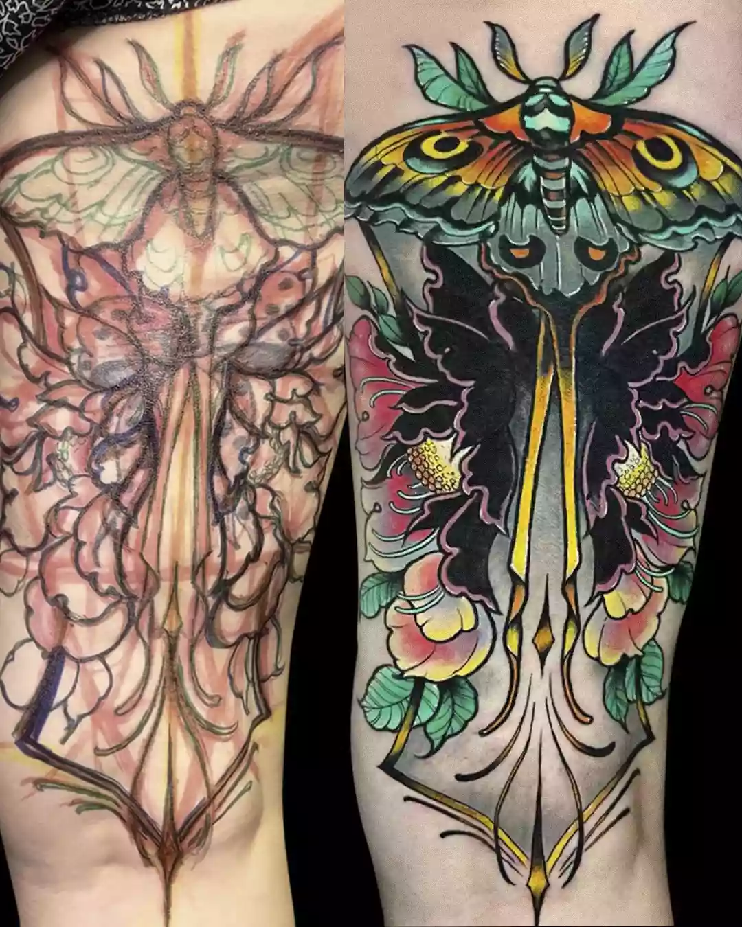Por otra parte, si lo que te gustaría no es cubrir el tattoo sino mejorarlo, podemos estudiar la posibilidad de repasarlo, reavivar colores, añadir algún elemento que mejore la composición….también podemos valorar estas opciones para darle una nueva vida al trabajo que ya llevas. Seremos siempre honestos con las posibilidades reales que implique cada caso, tanto en lo que respecta a repasos como si la mejor opción para mejorar de verdad lo que llevas es hacer un cover.